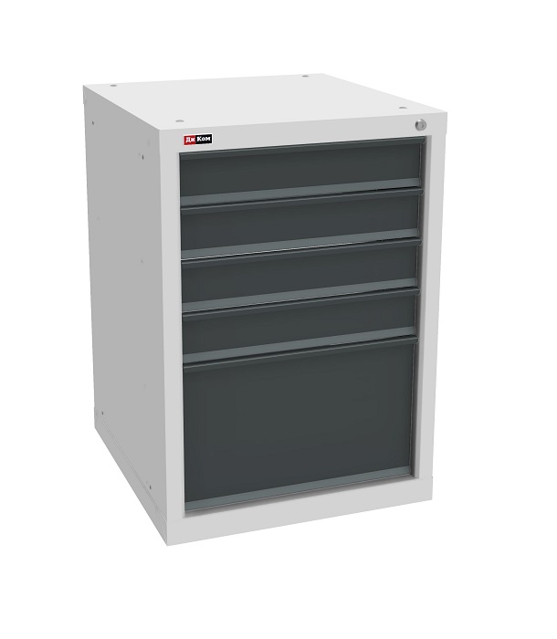 В комплектацию верстака входит: столешница ВЛ-К 150, одна опора ВЛ-К, косынки для опоры ВЛ-К, тумба ВЛ-К-015. Столешница выполнена из фанеры (24 мм) с покрытием из оцинкованного листа металла. Тумба ВЛ-К-015 комплектуется 5 выдвижными ящиками с телескопическими направляющими. Полезный размер ящиков (ВхШхГ): 1-280х459х459 мм, 4-80х459х459 мм. Тумба закрывается центральным ключевым замком (50 000 циклов). Опора сварная. Размер опоры (ВхШхГ) - 800х40х660 мм.