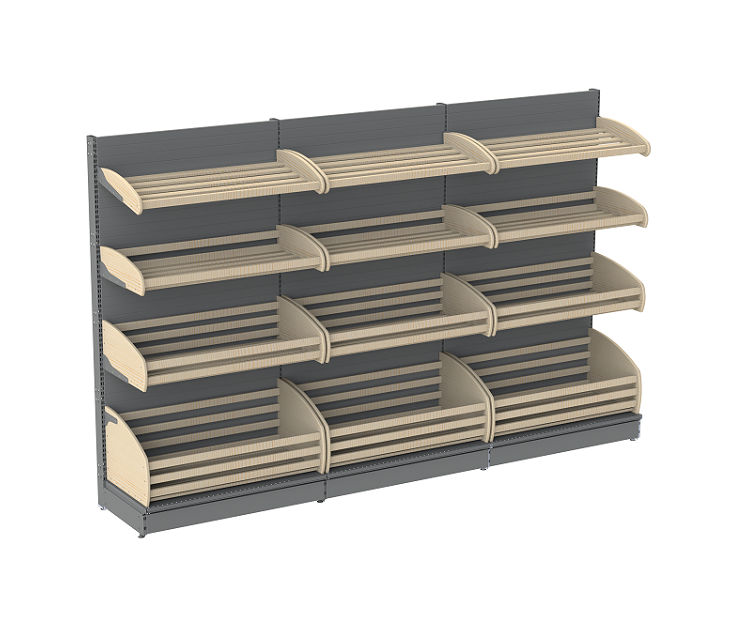 Дополнительные опции: можно увеличить/уменьшить высоту стеллажа (высота: от 1050 мм до 2950 мм), изменить ширину и глубину стеллажа (ширина: 665 мм, 1000 мм, 1250 мм, 1330 мм, глубина: 300 мм, 400 мм, 500 мм, 600 мм), комбинировать стеллаж полками и стенками. Возможно установить стеллаж отдельно стоящим, островным, угловым или собрать в единую линию. А также дополнять стеллажи навесными элементами, фризами, торцевыми панелями, ценникодержателями, ограничителями и другими элементами стеллажа.